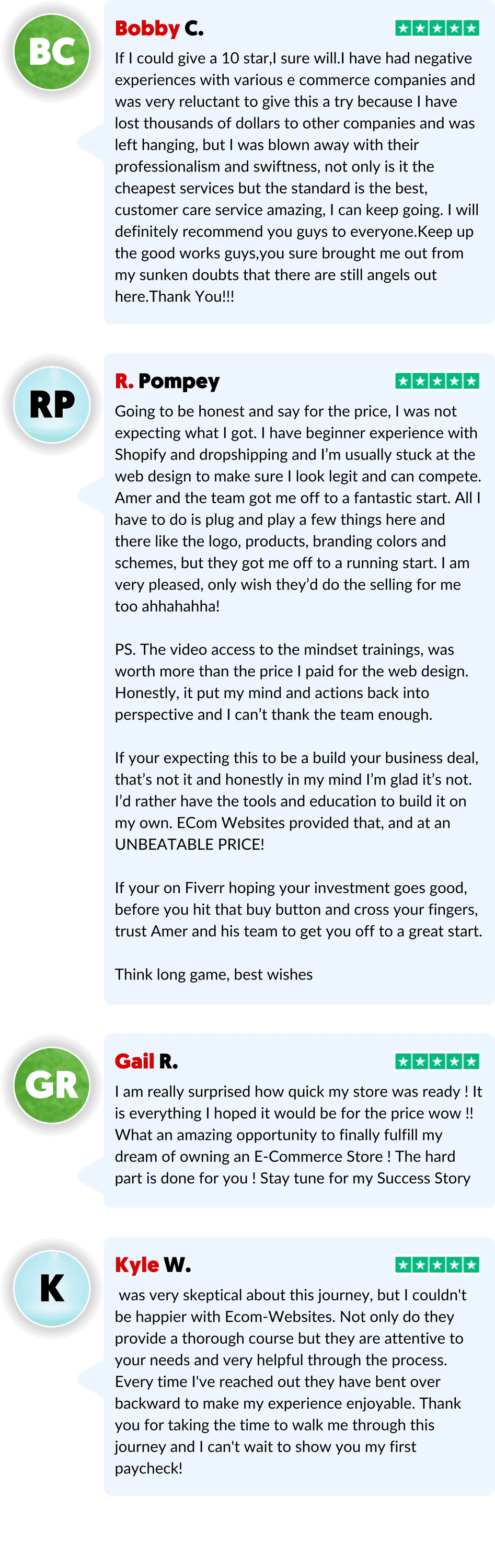 *You recognize and agree that we "Ecom Websites LLC" & ecom-websites.com have made no implications, warranties, promises, suggestions, projections, representations or guarantees whatsoever to you about future sales or results, or that you will earn any money and that we have not authorized any such projection, promise, or representation by others. You must obtain advice on taxes (affiliate marketing taxes, sales tax, income tax, business taxes, etc.) from a tax professional. You must obtain business formation, legal and patent advice from a legal professional. we take no responsibility for any information given that falls under those categories. You accept that we are not tax or legal professionals. You must consult a legal professional for advice on these topics. we make absolutely NO guarantee of success, monetary or otherwise, and we take no responsibility for any time or money spent in relation to this service, course, products, advertising, our assistance, or otherwise. Only one person may access our products per purchase. If a user is seen allowing others to use his account to access the course, that person will be removed the course without a refund. You may not share this information with others not enrolled in the course. If you are found uploading these videos or sharing information anywhere else, you will be removed without refund. Results may vary. You Accept that although you use our services & Products, you may not receive the sales or income desired. we are not responsible for your well-being or your income. Please be aware of this.
